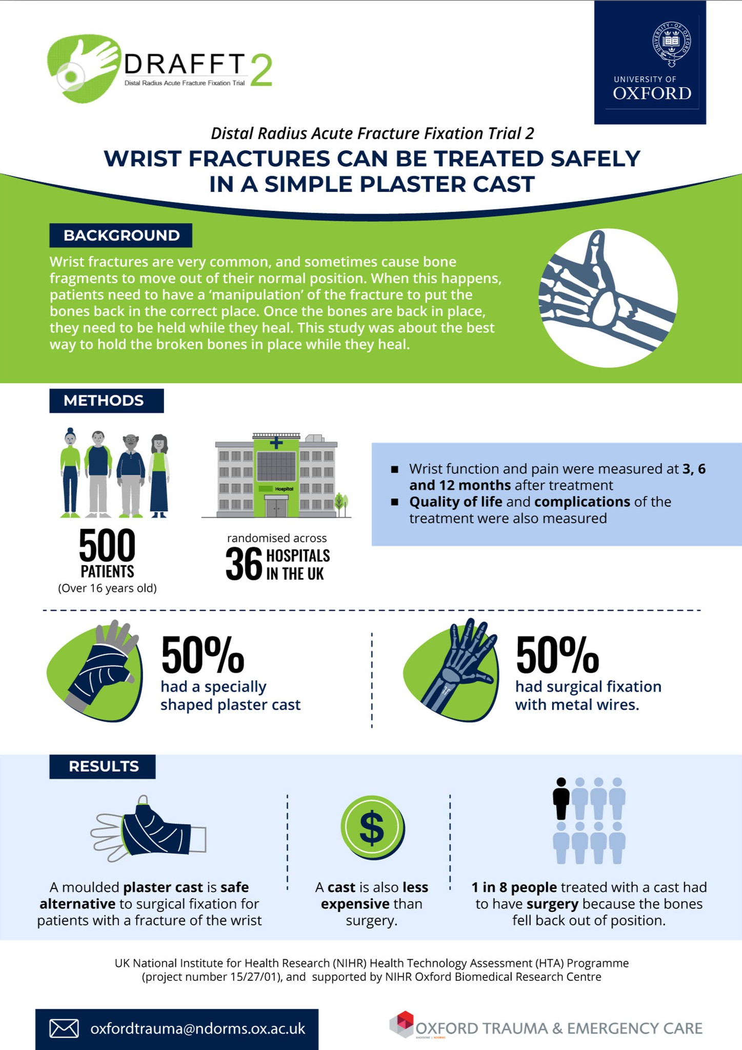 The DRAFFT2 study was a randomised controlled trial comparing plaster cast with surgical fixation for patients with a wrist fracture.