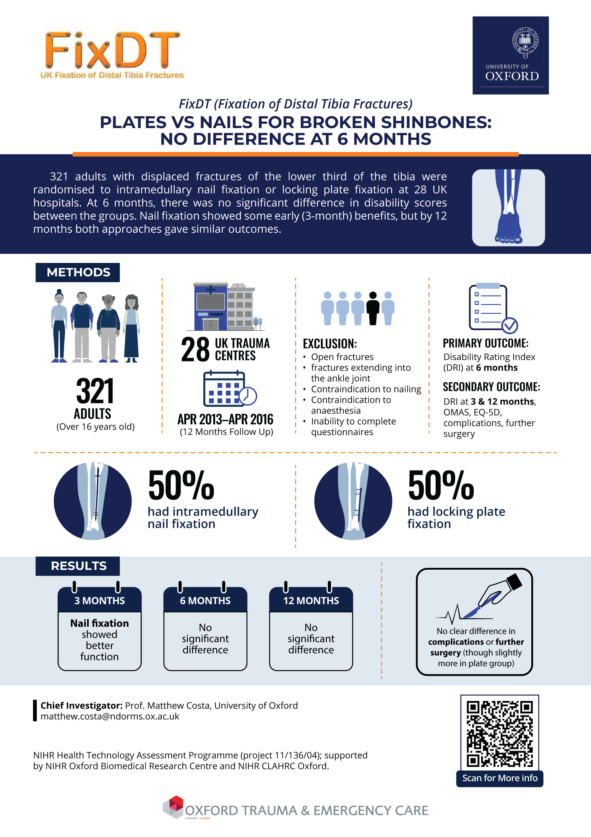 - [Main Study Result] 'Effect of Locking Plate Fixation vs Intramedullary Nail Fixation on 6-Month Disability Among Adults With Displaced Fracture of the Distal Tibia: The UK FixDT Randomized Clinical Trial' published in JAMA