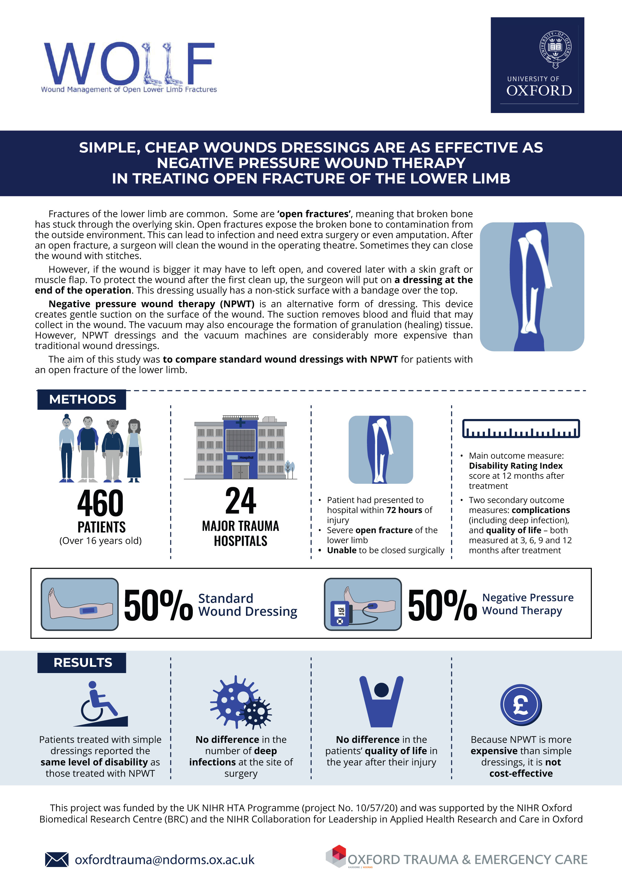 The WOLLF study was a randomised controlled trial comparing standard wound dressings with negative pressure wound therapy for patients with an open fracture of the leg. The study measured patients' disability, risk of infection and quality of life during their recovery.